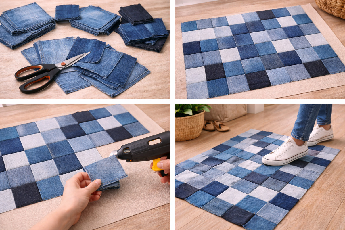 Нарежьте джинсы на квадраты 10х10 см. Не обязательно ровные — фактура прощает.