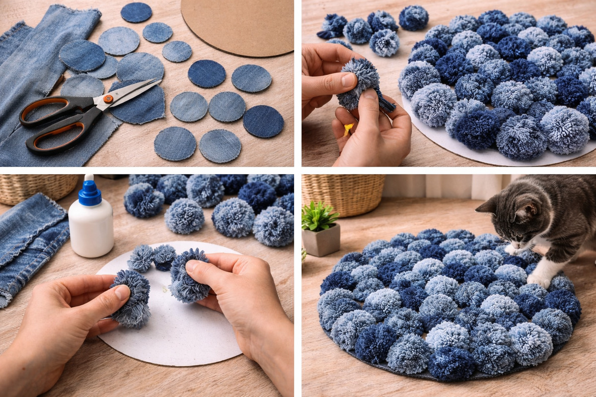 Способ второй: помпонный коврик из джинсовых кружочков