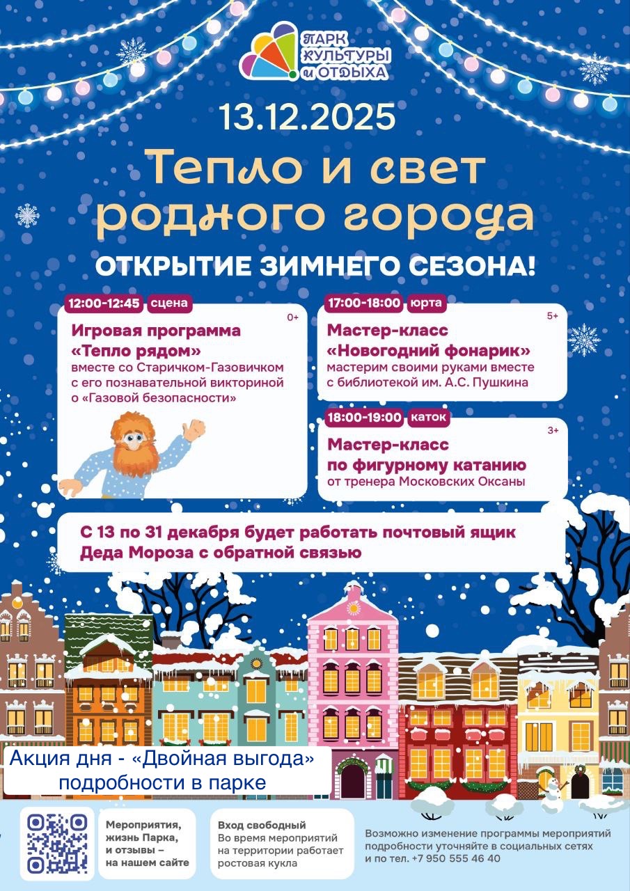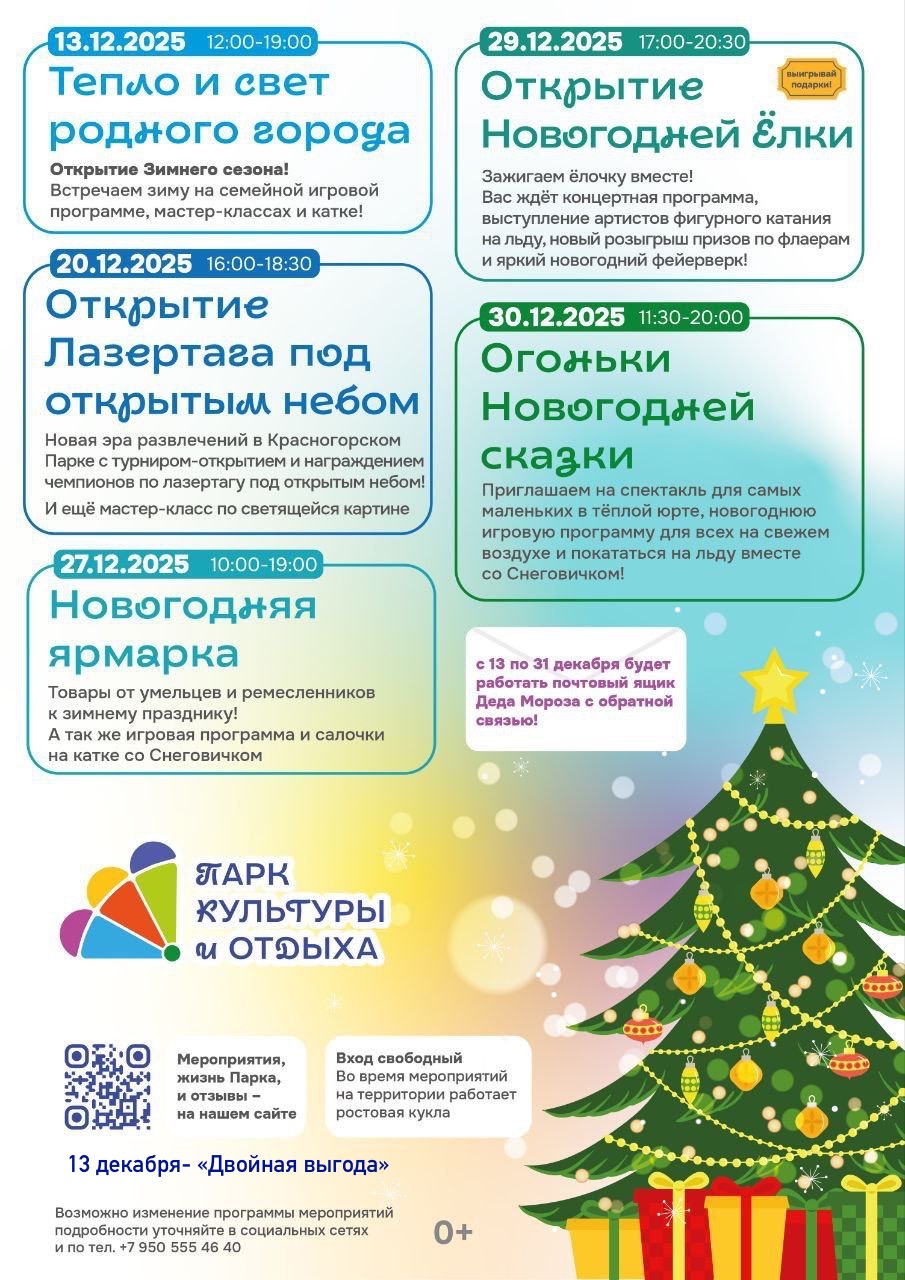 Публикуем афишу на 13 декабря и анонс мероприятий парка до конца года, чтобы вы могли планировать выходные. И дарим нашим читателям 100 бонусов на развлечения в парке. Чтобы их получить достаточно позвонить или написать в группу ВК Парка https://vk.com/pkio_ku или сразу перейти в ТГ-бот парка по ссылке https://t.me/pkiohelpbot?start=ku66