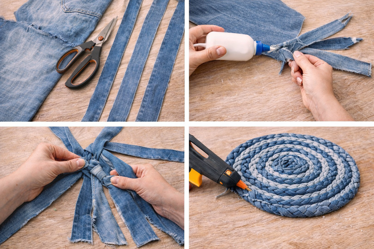 - Беру старые джинсы и ножницы — делаю коврик, который не отличить от магазинного: соседи просят научить